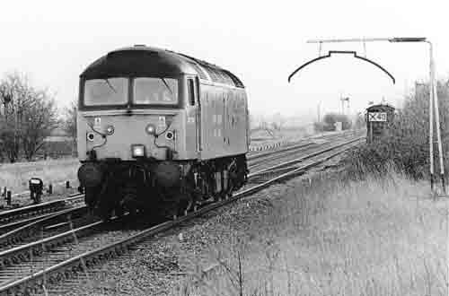 Looking towards Ely with a westbound light engine, taken from the area by the side of the road, using a 135mm lens (I think), also in February 1999. A set of steps is useful when doing this shot, which can also be done with a shorter lens. As far as I know, the brakevan (behind the 'X40' sign) is still on the disconnected remains of the former down loop.